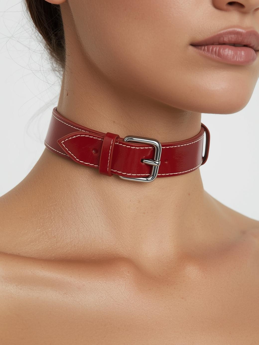 Scarlet Stitch Leather Choker, zamansız minimal tasarımı güçlü kırmızı tonuyla birleştirir. Kontrast beyaz el dikişi ve parlak metal tokası ile hem şık hem iddialı bir görünüm sunar.