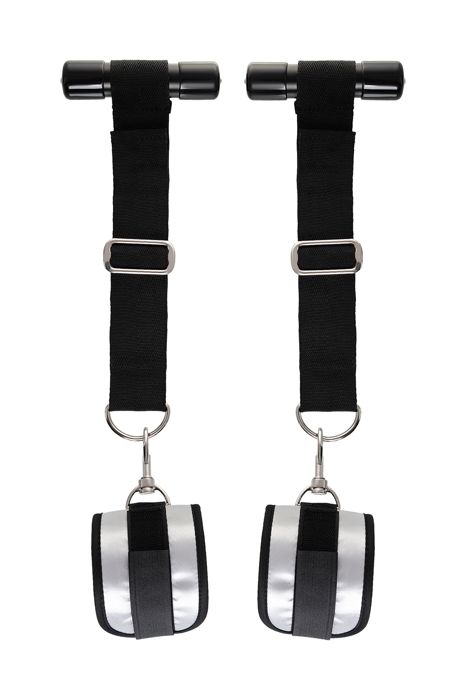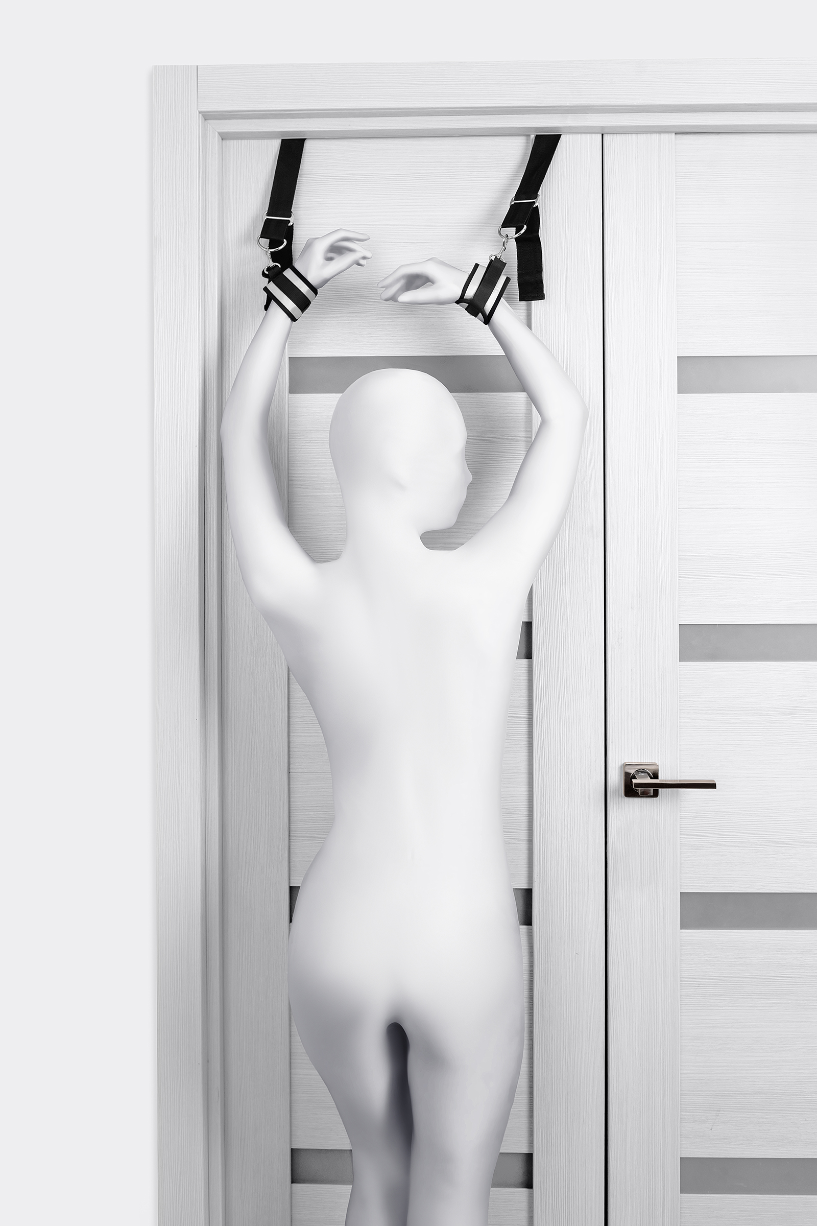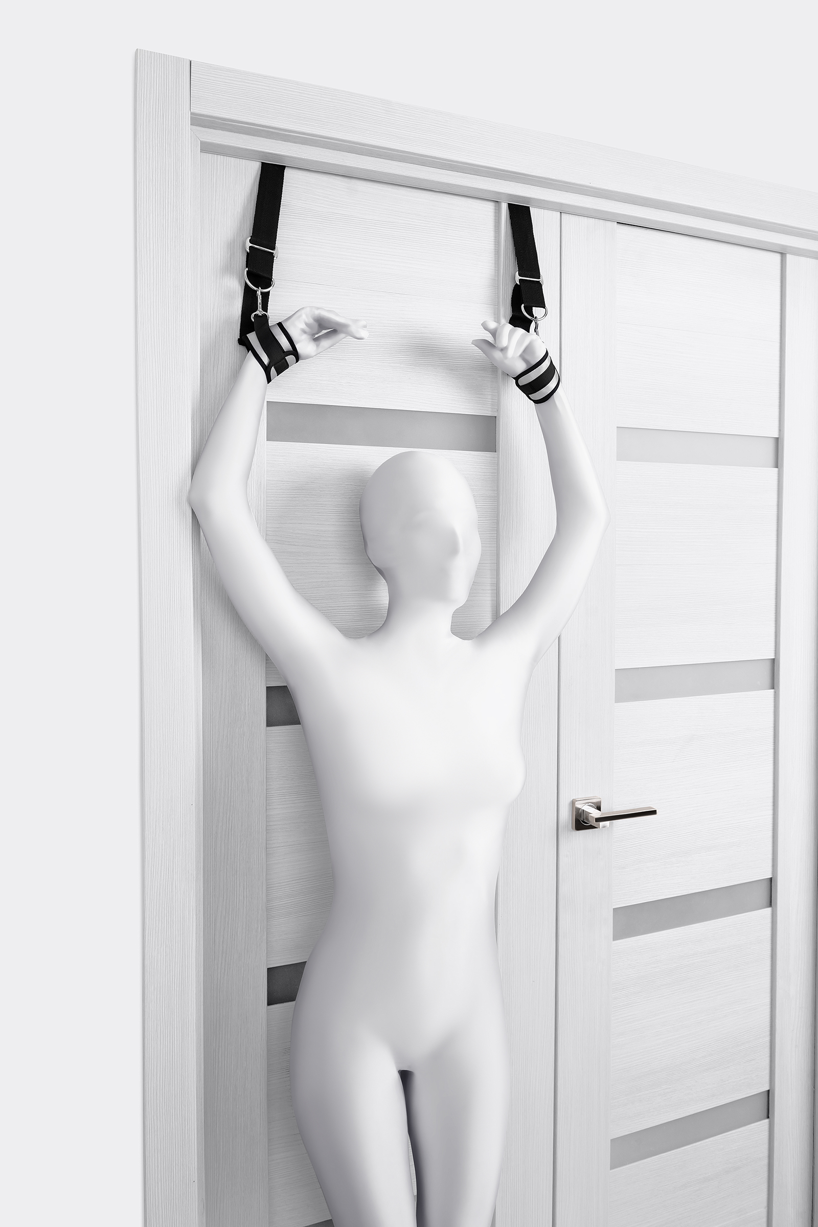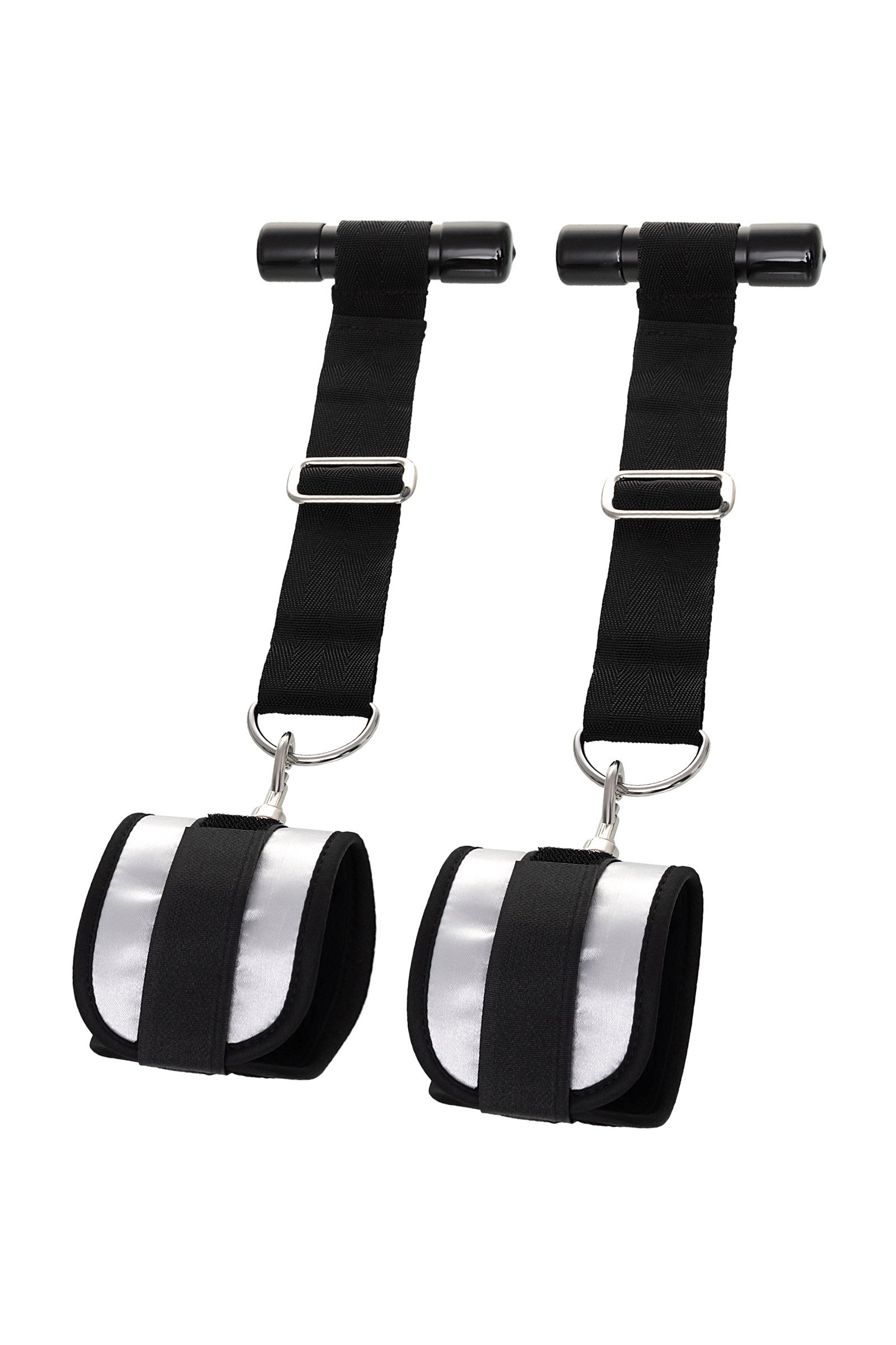 Plastik silindirler kapının arkasına sabitlenir, kelepçeler bileklere bir Velcro toka ile tutturulur. Boyut kemerlerden kolayca ayarlanabilir ve herhangi bir boyuttaki bileklere uyacaktır.