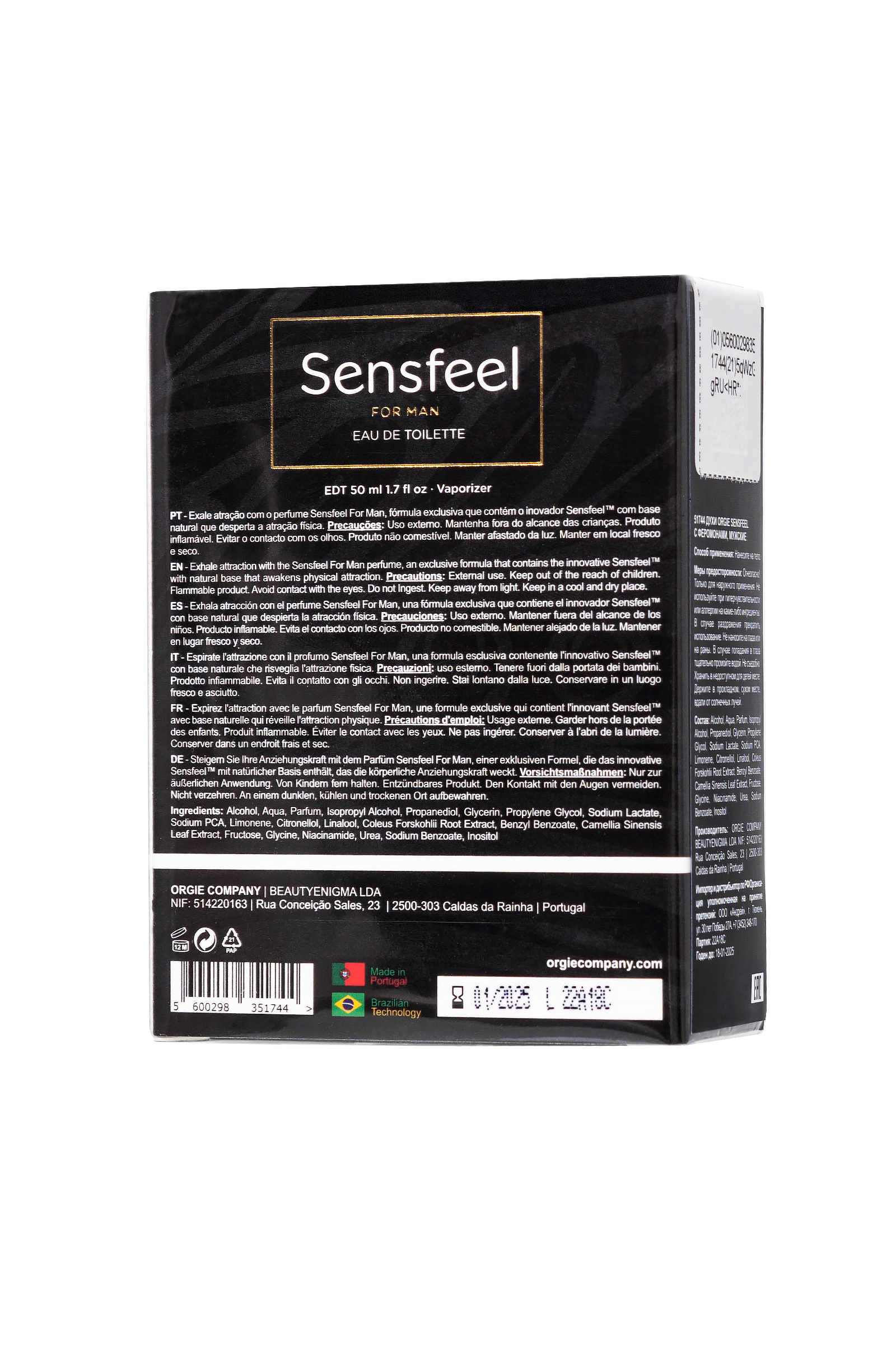 Sensfeel For Man feromonlarına sahip parfüm sayesinde karşı cinsten ilgi ve cazibe birkaç kez artmaktadır. Parfümeri bileşiminin özel formülü, androstadienon üretimine katkıda bulunan forskolin ve teaflavinlerin iki bileşeninin etkileşimi nedeniyle erkeklerin fiziksel çekiciliğini arttıran doğal olarak aktif bir bileşen içerir.