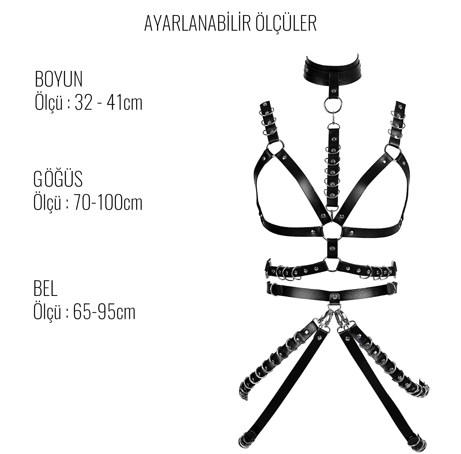 Tüm vücut harness, özellikle alternatif moda, fetiş giyim, cosplay, performans ve BDSM sahneleme ortamları için mükemmel bir tamamlayıcı parçadır. Fakat aynı zamanda klasik kıyafetlerin üzerine de giyilerek moda ifadesi olarak kullanılabilir. Hem maskülen hem feminen tarzlara uyum sağlayabilen bu unisex tasarım, farklı bedenler için ayarlanabilir tokalarıyla S-L aralığındaki bedenlere uygundur.